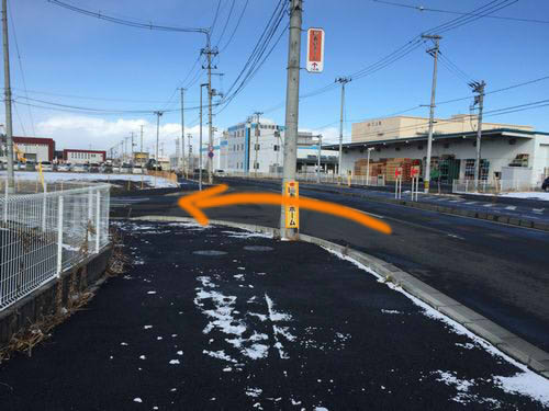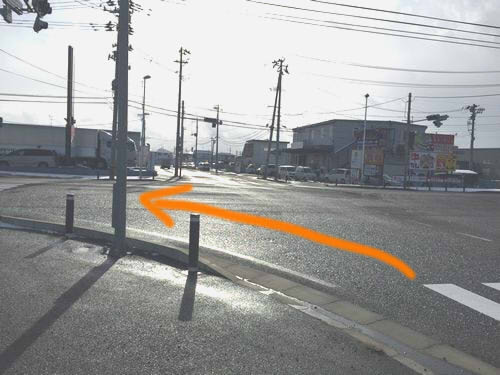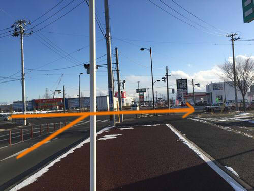 アウトレットとニトリの間の道を行くと、1つ目の交差点が見えるので、ここを右折します。